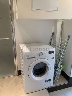 Este apartamento é equipado de uma casa de banho agradável. Esta sala de água dispõe do necessário pelo seu bem estar na sua vida quotidiana : toalhas de banho, armário, ducheiro separado, secador, sink, radiator secador de toalhas. Os WC são separados da casa de banho e situados em uma peça independente.