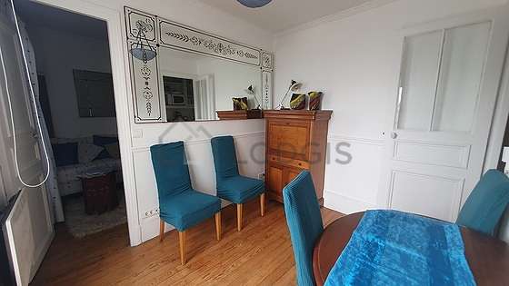 SalaõEste apartamento é composto de um agradável salão com parqué no piso. Este salão calmo mobiliado et equipado para uma agradável estância : televisaõ, colchas, mesa de jantar, secretária, roupeiro, 1 cadeira(s), mirror, carpet, vase.