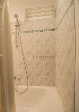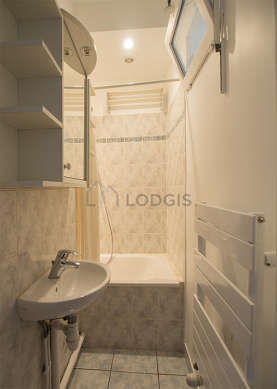 Este apartamento é equipado de uma casa de banho agradável. Esta sala de água dispõe do necessário pelo seu bem estar na sua vida quotidiana : toalhas de banho, prateleira, armário, sink, radiator secador de toalhas. Os WC são separados da casa de banho e situados em uma peça independente.