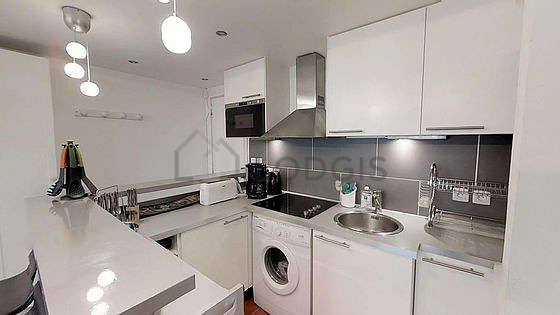 Este apartamento tem uma magnífico cozinha com azuleijo no piso e todo o equipamento pela sua vida quotidiana : fogaõ, congelador, micro-ondas combinado, exaustur, torradeira, chaleira, máquina de café, prateleira, armário, loiça.