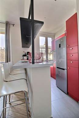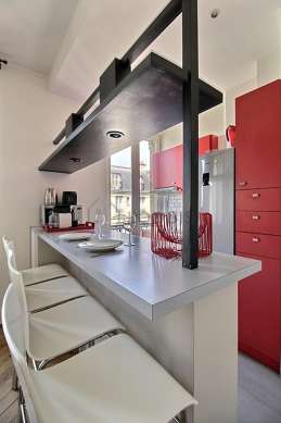 Este apartamento tem uma magnífico cozinha com azuleijo no piso e todo o equipamento pela sua vida quotidiana : fogaõ, frigorífico, congelador, forno, microondas, exaustur, torradeira, máquina de café, prateleira, armário, loiça, banco, bar, bin.