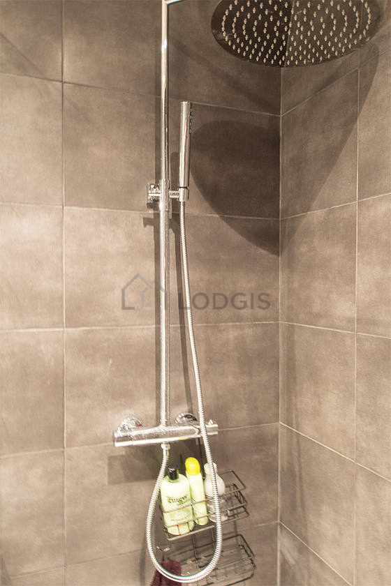 Este apartamento é equipado de uma casa de banho agradável. Esta sala de água dispõe do necessário pelo seu bem estar na sua vida quotidiana : toalhas de banho, armário, ducheiro separado, radiator secador de toalhas. Os WC são separados da casa de banho e situados em uma peça independente.