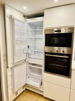 Este apartamento tem uma magnífico cozinha com parqué no piso e todo o equipamento pela sua vida quotidiana : fogaõ, frigorífico, congelador, forno, microondas, exaustur, chaleira, máquina de café, comoda, loiça.