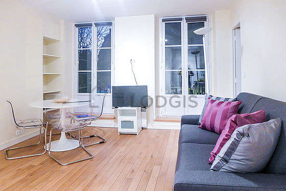Este apartamento é composto de um atraente salão com parqué no piso é janelas. Este salão calmo mobiliado et equipado para uma agradável estância : televisaõ, lençois, colchas, sofá, mesa de jantar, 1 cadeira(s).