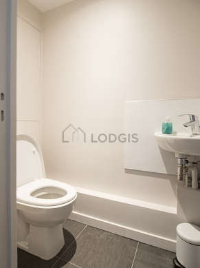 Este apartamento é equipado de uma casa de banho magnífico. Esta sala de água dispõe do necessário pelo seu bem estar na sua vida quotidiana : roupeiro, prateleira, armário, ducheiro separado, sink, mirror. Os WC são integrados na casa de banho.