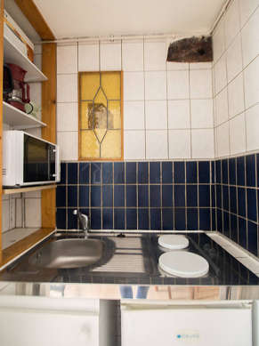 Este apartamento tem uma bonita cozinha com azuleijo no piso e todo o equipamento pela sua vida quotidiana : fogaõ, frigorífico, microondas, torradeira, chaleira, máquina de café, mesa de jantar, prateleira, armário, loiça, casserole dish, cutlery, stove.