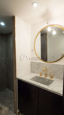 Este apartamento é equipado de uma casa de banho magnífico é clara. Esta sala de água dispõe do necessário pelo seu bem estar na sua vida quotidiana : toalhas de banho, prateleira, armário, ducheiro separado, sink. Os WC são integrados na casa de banho.