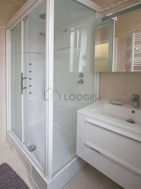 Este apartamento é equipado de uma casa de banho magnífico é clara. Esta sala de água dispõe do necessário pelo seu bem estar na sua vida quotidiana : toalhas de banho, armário, ducheiro separado, sink, radiator secador de toalhas. Os WC são separados da casa de banho e situados em uma peça independente.