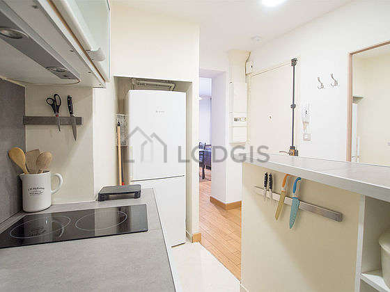 Este apartamento tem uma magnífico cozinha com azuleijo no piso e todo o equipamento pela sua vida quotidiana : fogaõ, frigorífico, congelador, micro-ondas combinado, torradeira, máquina de café, armário, banco, bar, bin.