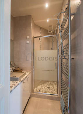 Este apartamento é equipado de uma casa de banho agradável. Esta sala de água dispõe do necessário pelo seu bem estar na sua vida quotidiana : toalhas de banho, armário, ducheiro separado, sink, radiator secador de toalhas. Os WC são separados da casa de banho e situados em uma peça independente.