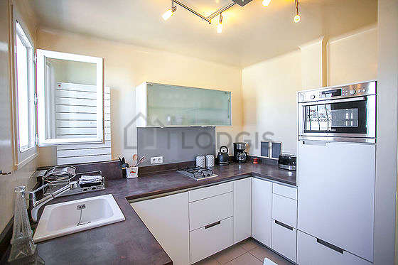 Este apartamento tem uma bonita cozinha com parqué no piso e todo o equipamento pela sua vida quotidiana : frigorífico, forno, microondas, freezer, torradeira, máquina de café, mesa de jantar, loiça, 1 cadeira(s).