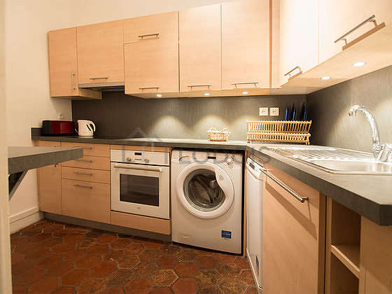 Este apartamento tem uma bonita cozinha com piso de ceramica no piso e todo o equipamento pela sua vida quotidiana : fogaõ, frigorífico, forno, microondas, chaleira, máquina de café, prateleira, armário, loiça, bar.