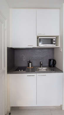 Este apartamento tem uma bonita cozinha com parqué no piso e todo o equipamento pela sua vida quotidiana : fogaõ, frigorífico, congelador, micro-ondas combinado, exaustur, torradeira, chaleira, armário, loiça.