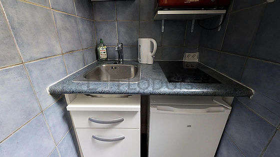 Este apartamento tem uma bonita cozinha com azuleijo no piso e todo o equipamento pela sua vida quotidiana : fogaõ, frigorífico, microondas, freezer, prateleira, armário, loiça.