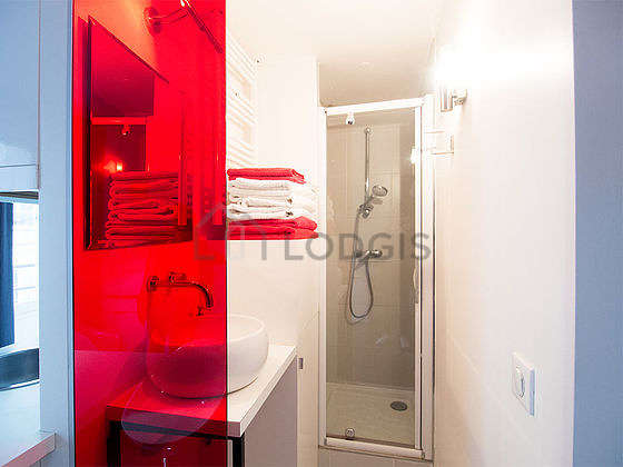 Este apartamento é equipado de uma casa de banho magnífico é clara. Esta sala de água dispõe do necessário pelo seu bem estar na sua vida quotidiana : armário, ducheiro separado, sink, mirror, radiator secador de toalhas. Os WC são separados da casa de banho e situados em uma peça independente.