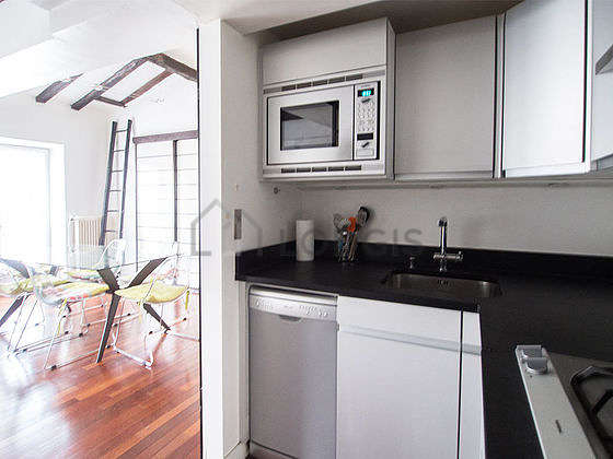 Este apartamento tem uma magnífico cozinha com parqué no piso e todo o equipamento pela sua vida quotidiana : fogaõ, frigorífico, congelador, forno, microondas, micro-ondas combinado, exaustur, torradeira, chaleira, máquina de café, prateleira, armário, loiça.