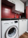Este apartamento tem uma magnífico cozinha com parqué no piso e todo o equipamento pela sua vida quotidiana : fogaõ, frigorífico, forno, chaleira, máquina de café, prateleira, armário.