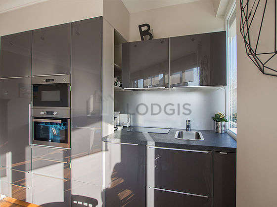 Este apartamento tem uma magnífico cozinha com parqué no piso e todo o equipamento pela sua vida quotidiana : fogaõ, frigorífico, congelador, forno, micro-ondas combinado, exaustur, torradeira, máquina de café, mesa de jantar, armário, loiça, 1 cadeira(s).
