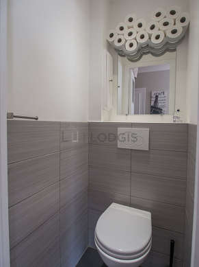 Este apartamento é equipado de uma casa de banho magnífico é muito clara. Esta sala de água dispõe do necessário pelo seu bem estar na sua vida quotidiana : toalhas de banho, prateleira, armário, ducheiro separado, sink, radiator secador de toalhas. Os WC são separados da casa de banho e situados em uma peça independente.
