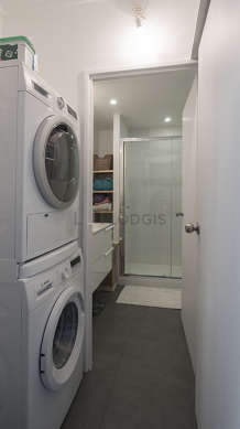 Este apartamento é equipado de uma casa de banho magnífico é clara. Esta sala de água dispõe do necessário pelo seu bem estar na sua vida quotidiana : toalhas de banho, roupeiro, prateleira, armário, ducheiro separado, sink, radiator secador de toalhas. Os WC são integrados na casa de banho.