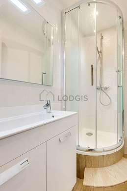 Este apartamento é equipado de uma casa de banho magnífico é muito clara. Esta sala de água dispõe do necessário pelo seu bem estar na sua vida quotidiana : toalhas de banho, ducheiro separado, sink. Os WC são separados da casa de banho e situados em uma peça independente.