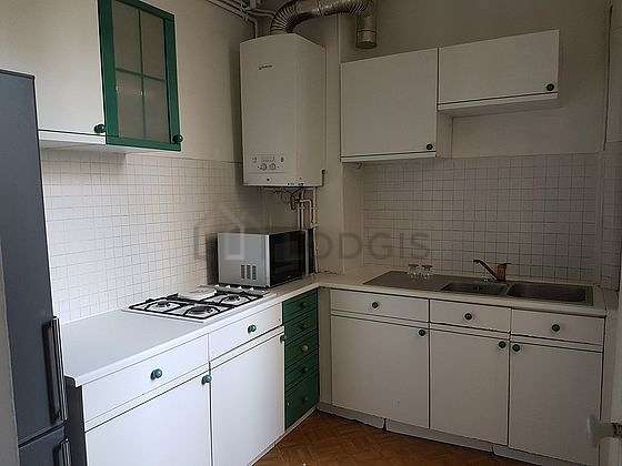 Este apartamento tem uma magnífico cozinha com parqué no piso e todo o equipamento pela sua vida quotidiana : fogaõ, frigorífico, congelador, micro-ondas combinado, armário, loiça.