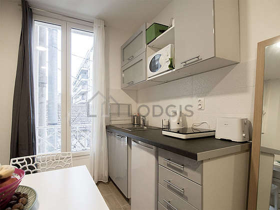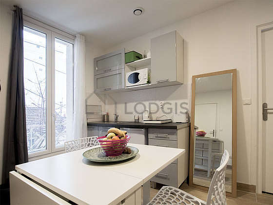 Este apartamento tem uma magnífico cozinha com azuleijo no piso e todo o equipamento pela sua vida quotidiana : fogaõ, frigorífico, microondas, torradeira, chaleira, mesa de jantar, prateleira, guarda-roupa, armário, loiça, 2 cadeira(s).