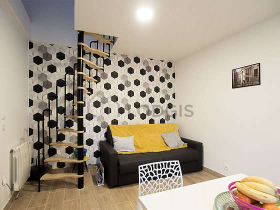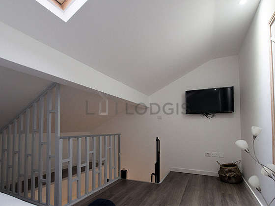 Graças a sua altura de teto, um magnífico mezanino foi possível de ser instalado em este apartamento , oferecendo-lhe uma verdadeira peça suplementar equipada de televisaõ, colchas.