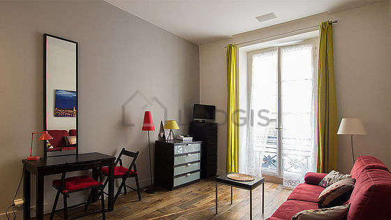 SalaõEste apartamento é composto de um agradável salão com parqué no piso é janelas vitros duplos é vista sobre rua. Este salão calmo mobiliado et equipado para uma agradável estância : televisaõ, lençois, colchas, sofá, mesa de jantar, mesinha, comoda, 2 cadeira(s)1 sofá-cama.