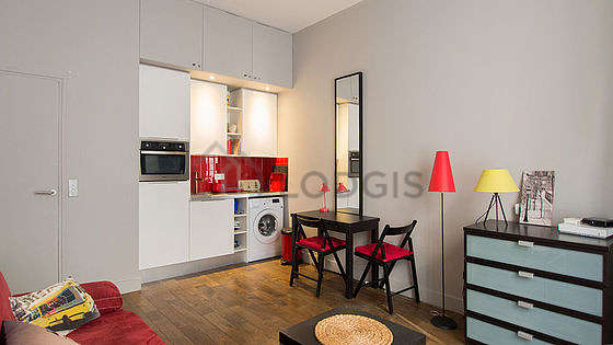 Este apartamento tem uma bonita cozinha com parqué no piso e todo o equipamento pela sua vida quotidiana : fogaõ, frigorífico, micro-ondas combinado, chaleira, máquina de café, prateleira, armário, loiça.