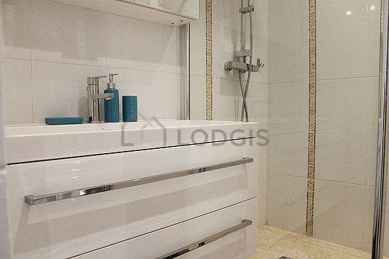 Este apartamento é equipado de uma casa de banho magnífico é muito clara. Esta sala de água dispõe do necessário pelo seu bem estar na sua vida quotidiana : toalhas de banho, guarda-roupa, armário, ducheiro separado, secador, sink, towel rack, bin, radiator secador de toalhas. Os WC são separados da casa de banho e situados em uma peça independente.