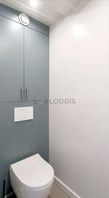 Este apartamento é equipado de uma casa de banho magnífico é clara. Esta sala de água dispõe do necessário pelo seu bem estar na sua vida quotidiana : armário, ducheiro separado, viga, sink, radiator secador de toalhas. Os WC são separados da casa de banho e situados em uma peça independente.