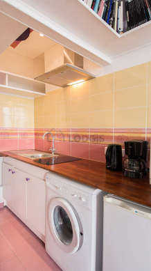 Este apartamento tem uma bonita cozinha com azuleijo no piso e todo o equipamento pela sua vida quotidiana : fogaõ, frigorífico, microondas, freezer, exaustur, chaleira, máquina de café, prateleira, armário, loiça.