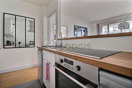Este apartamento tem uma magnífico cozinha com azuleijo no piso e todo o equipamento pela sua vida quotidiana : fogaõ, frigorífico, forno, microondas, torradeira, loiça.