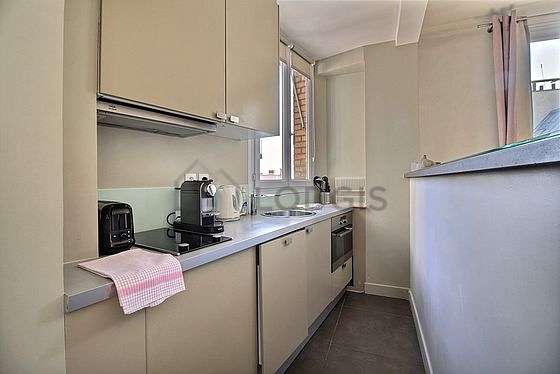 Este apartamento tem uma magnífico cozinha com azuleijo no piso e todo o equipamento pela sua vida quotidiana : fogaõ, frigorífico, microondas, torradeira, prateleira, loiça, banco, bar.