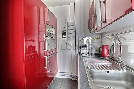 Este apartamento tem uma magnífico cozinha com parqué no piso e todo o equipamento pela sua vida quotidiana : fogaõ, frigorífico, congelador, micro-ondas combinado, torradeira, chaleira, máquina de café, armário, loiça.