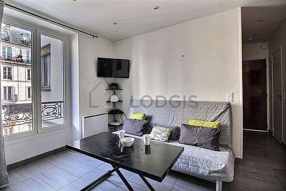 SalaõEste apartamento é composto de um magnífico salão com parqué no piso é janelas. Este salão very quiet mobiliado et equipado para uma agradável estância : televisaõ, sofá, mesa de jantar, mesinha, 1 cadeira(s)1 cama.
