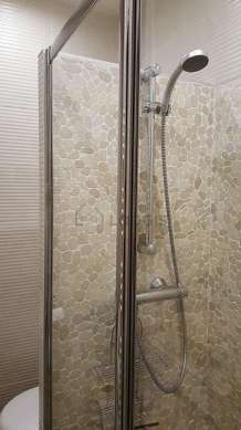 Este apartamento é equipado de uma casa de banho magnífico. Esta sala de água dispõe do necessário pelo seu bem estar na sua vida quotidiana : toalhas de banho, ducheiro separado, secador, sink, mirror, towel rack, ventilator. Os WC são integrados na casa de banho.