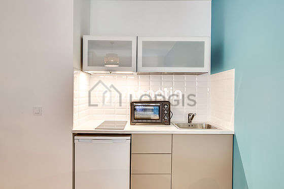Este apartamento tem uma magnífico cozinha com parqué no piso e todo o equipamento pela sua vida quotidiana : fogaõ, frigorífico, congelador, forno, mesa de jantar, armário, 1 cadeira(s).