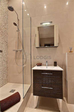 Este apartamento é equipado de uma casa de banho magnífico é clara. Esta sala de água dispõe do necessário pelo seu bem estar na sua vida quotidiana : toalhas de banho, guarda-roupa, ducheiro separado, secador, sink, mirror, towel rack, bin, radiator secador de toalhas, carpet, ventilator. Os WC são integrados na casa de banho.
