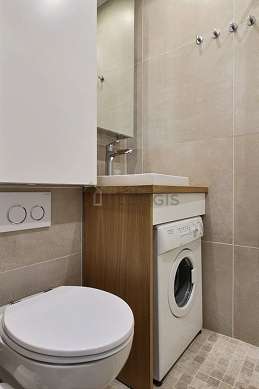 Este apartamento é equipado de uma casa de banho magnífico. Esta sala de água dispõe do necessário pelo seu bem estar na sua vida quotidiana : toalhas de banho, prateleira, armário, ducheiro separado, sink, sink, radiator secador de toalhas. Os WC são integrados na casa de banho.