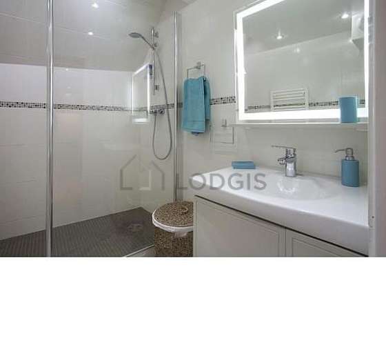 Este apartamento é equipado de uma casa de banho magnífico. Esta sala de água dispõe do necessário pelo seu bem estar na sua vida quotidiana : toalhas de banho, armário, ducheiro separado, secador, airer, sink, mirror, towel rack, bin, radiator secador de toalhas, ventilator. Os WC são integrados na casa de banho.