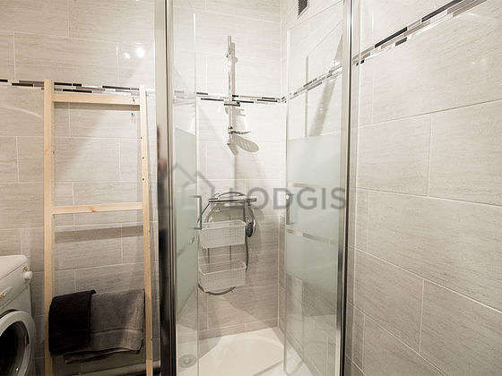 Este apartamento é equipado de uma casa de banho magnífico. Esta sala de água dispõe do necessário pelo seu bem estar na sua vida quotidiana : prateleira, armário, ducheiro separado, sink, radiator secador de toalhas. Os WC são separados da casa de banho e situados em uma peça independente.