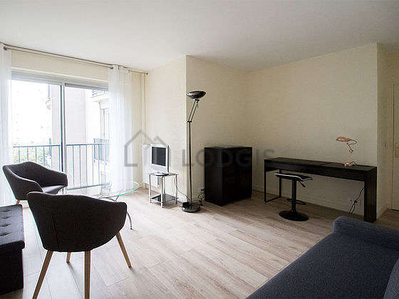 SalaõEste apartamento é composto de um soberbo salão com parqué no piso é janelas é vista sobre jardim. Este salão very quiet mobiliado et equipado para uma agradável estância : televisaõ, lençois, colchas, 1 poltrona(s), mesinha, secretária, comoda, floor lamp, tv stand.