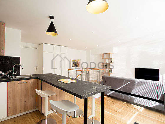Este apartamento tem uma magnífico cozinha com parqué no piso e todo o equipamento pela sua vida quotidiana : fogaõ, frigorífico, congelador, forno, microondas, exaustur, torradeira, máquina de café, prateleira, armário, loiça, banco, bar.