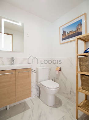Este apartamento é equipado de uma casa de banho magnífico. Esta sala de água dispõe do necessário pelo seu bem estar na sua vida quotidiana : armário, ducheiro separado, sink, radiator secador de toalhas. Os WC são integrados na casa de banho.