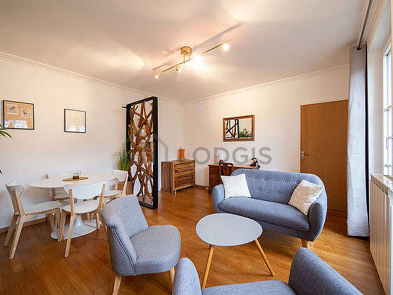 Este apartamento é composto de um charmoso salão com parqué no piso vista sobre rua. Este salão calmo mobiliado et equipado para uma agradável estância : televisaõ, sofá, 2 poltrona(s), mesa de jantar, mesinha, secretária, prateleira, comoda, 4 cadeira(s), banco.