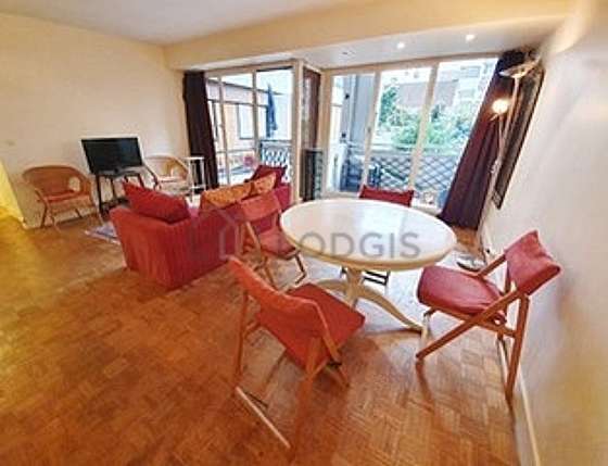SalaõEste apartamento é composto de um salão com parqué no piso. Este salão mobiliado et equipado para uma agradável estância : televisaõ, sofá, 1 poltrona(s), mesa de jantar, mesinha, biblioteca, prateleira, bufet, 1 cadeira(s).