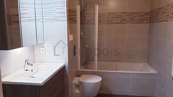 Este apartamento é equipado de uma casa de banho. Esta sala de água dispõe do necessário pelo seu bem estar na sua vida quotidiana : toalhas de banho, roupeiro, armário, banheira, sink, radiator secador de toalhas. Os WC são integrados na casa de banho.