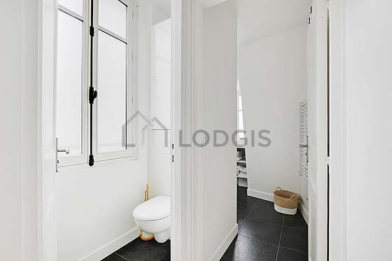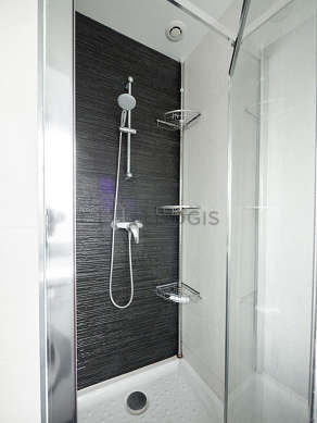 Este apartamento é equipado de uma casa de banho agradável é muito clara with janelas vitros duplos. Esta sala de água dispõe do necessário pelo seu bem estar na sua vida quotidiana : toalhas de banho, armário, ducheiro separado, sink, radiator secador de toalhas. Os WC são separados da casa de banho e situados em uma peça independente.